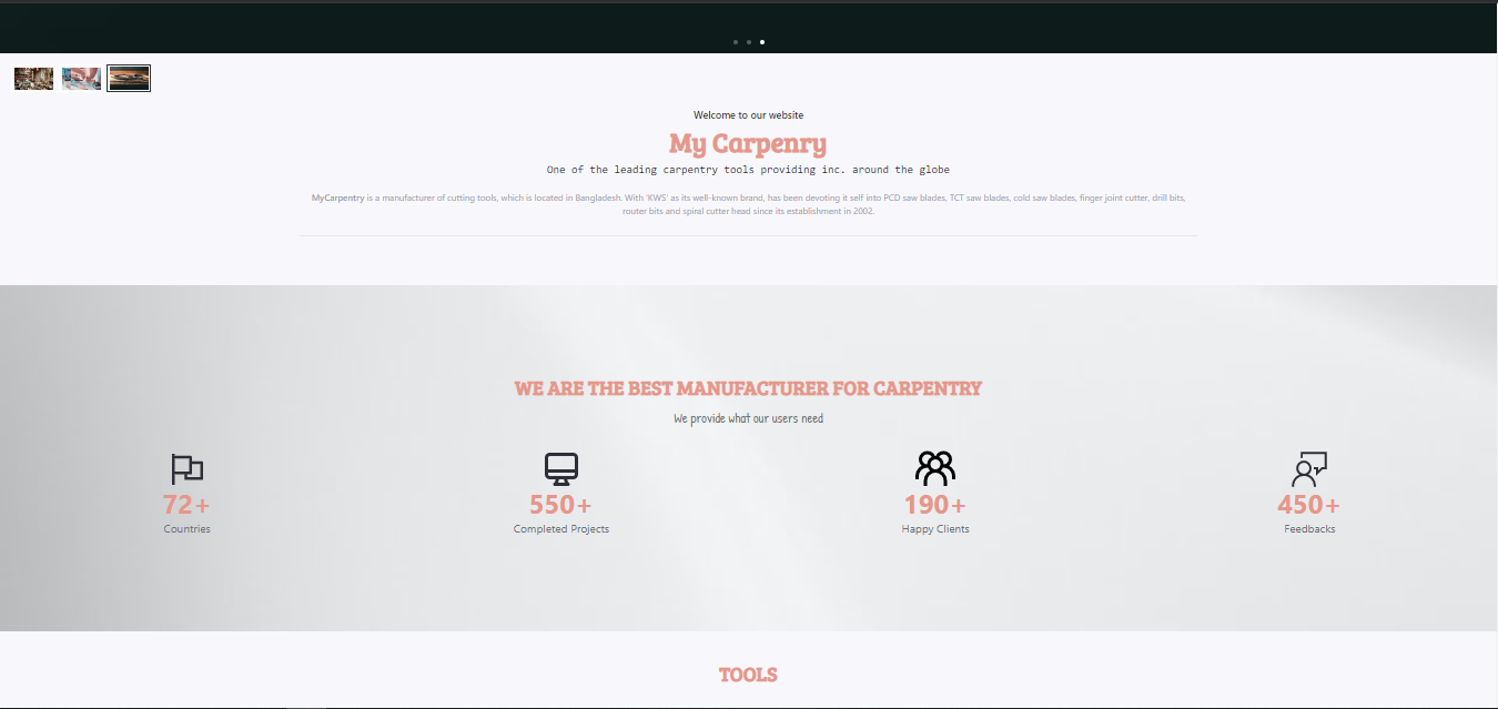 This website based on carpentry tool manufacturer. In here User and and Admin can see two different UI. An Admin can perform CRUD operations. And a user can buy, remove, pay for a tool he/she chooses. There are some authentication that user or admin can not do some action without login.